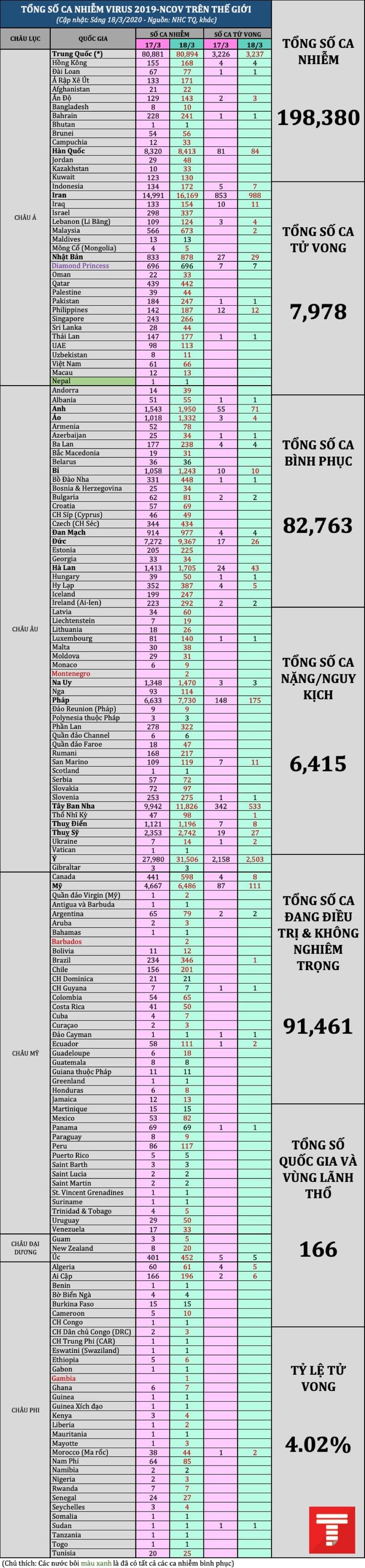 Thế giới 24h qua cũng có thêm hơn 15.700 ca nhiễm mới (so với hôm qua là 12.700) và ít nhất 803 ca tử vong mới (so với hôm qua là 621) – tiếp tục là con số kỷ lục kể từ đầu dịch. Toàn thế giới đã gần chạm mốc 200.000 ca nhiễm và gần 8.000 ca tử vong.