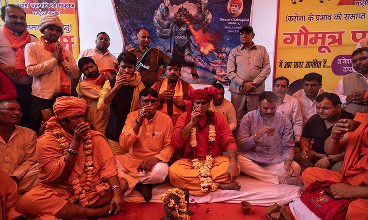 Tuần trước, hàng chục tín đồ Hindu đã tổ chức một bữa tiệc tại thủ đô New Delhi, trong đó họ tiến hành nghi lễ đốt lửa và uống nước tiểu bò trong những chiếc cốc nung bằng đất để chống Covid-19.
