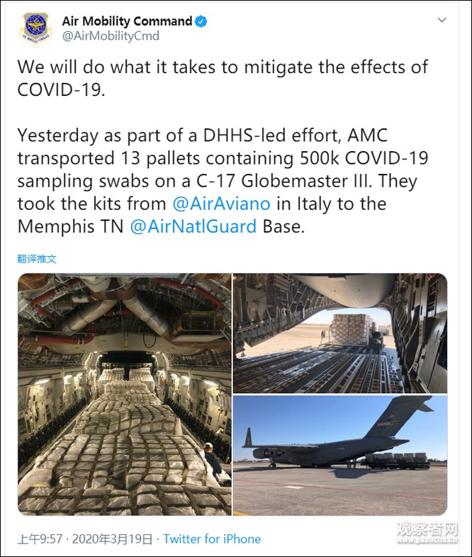 Theo trang tin Guancha.cn (Nhà quan sát), ngày 18/3, có cơ quan truyền thông Mỹ tiết lộ, ngày 17/3 quân đội Mỹ đã sử dụng máy bay vận tải quân sự để vận chuyển 500.000 bộ dụng cụ phát hiện virus Corona mới từ Italy về Mỹ. Người phát ngôn của Lầu Năm Góc sau đó nói rằng thứ mà quân đội Mỹ mang từ Italy về là 500.000 que gạc dùng cho việc lấy mẫu xét nghiệm (sampling swab). Người này nói, số vật tư này sẽ được phân phối cho các tiểu bang để xét nghiệm virus Corona mới. Tuy nhiên, quân đội Mỹ không đề cập đến nguồn cung cấp của số vật tư này.