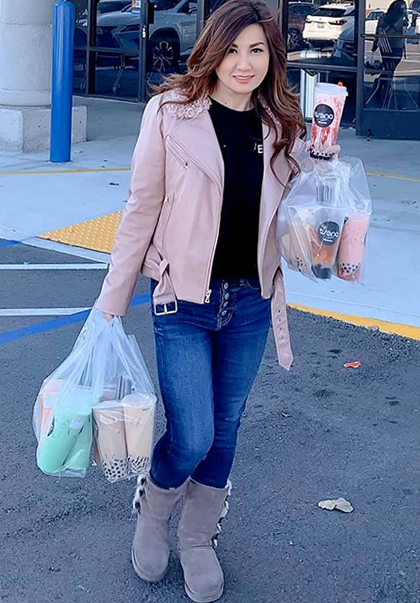 Trizzie Phương Trinh tự giao trà sữa cho khách. Ảnh: Facebook.