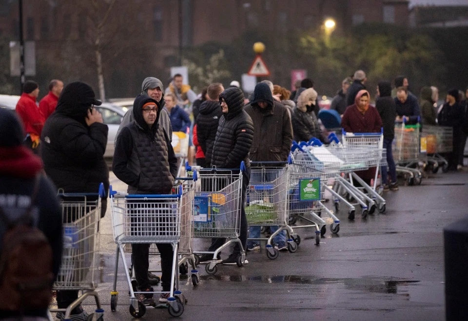Dù trời chưa sáng, nhiều người đã chờ bên ngoài siêu thị, với hy vọng mua đủ nhu yếu phẩm cho gia đình, khi Covid-19 đang lây lan nhanh ở Anh.