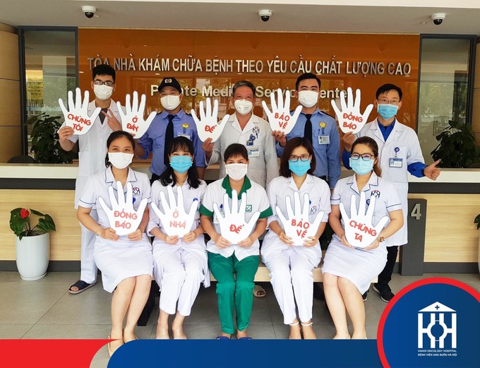 Thông điệp của đội ngũ nhân viên, bảo vệ, y bác sĩ bệnh viện Ung bướu Hà Nội kêu gọi mọi người ở nhà.