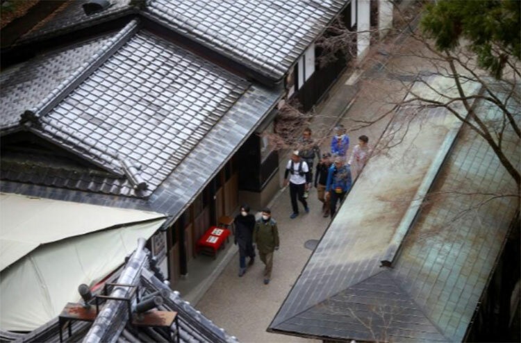 Một nhóm nhỏ du khách đi dạo trong khu vực đền Kyiomizu-dera ở Kyoto hôm 15/3. Ảnh: Reuters.