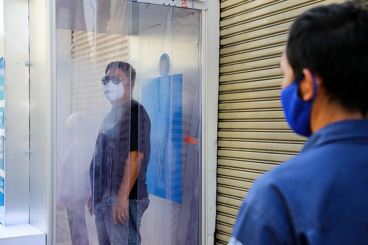 Người dân tiến hành khử khuẩn tại buồng khử khuẩn miễn phí góc đường Lê Khôi - Quách Đình Bảo (quận Tân Phú) ngày 26/3. Ảnh: Như Quỳnh.