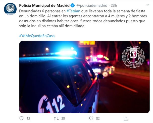 Thông báo của cảnh sát Madrid về cuộc đột kích tiệc thác loạn trên Twitter.