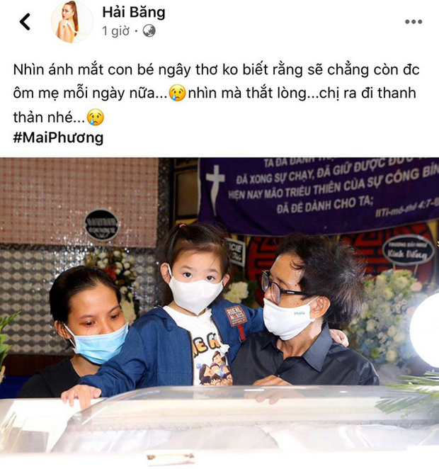 Khoảnh khắc bé Lavie bên linh cữu khiến bạn bè nghệ sĩ, khán giả của cố nghệ sĩ Mai Phương không kìm được nước mắt. Ca sĩ Hải Băng chia sẻ: "Nhìn ánh mắt con bé ngây thơ không biết rằng sẽ chẳng còn được ôm mẹ mỗi ngày nữa mà thắt lòng".
