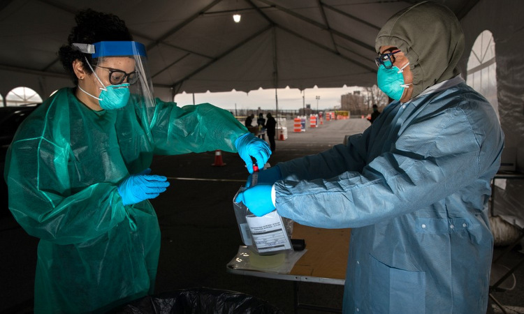 Nhân viên y tế đóng gói mẫu tại một điểm xét nghiệm ở thành phố New York hôm 28/3. Ảnh: AFP.