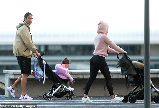 Cristiano Ronaldo và bạn gái đi đưa 2 con đi dạo trong thời gian tự cách ly. Ảnh: Dailymail.