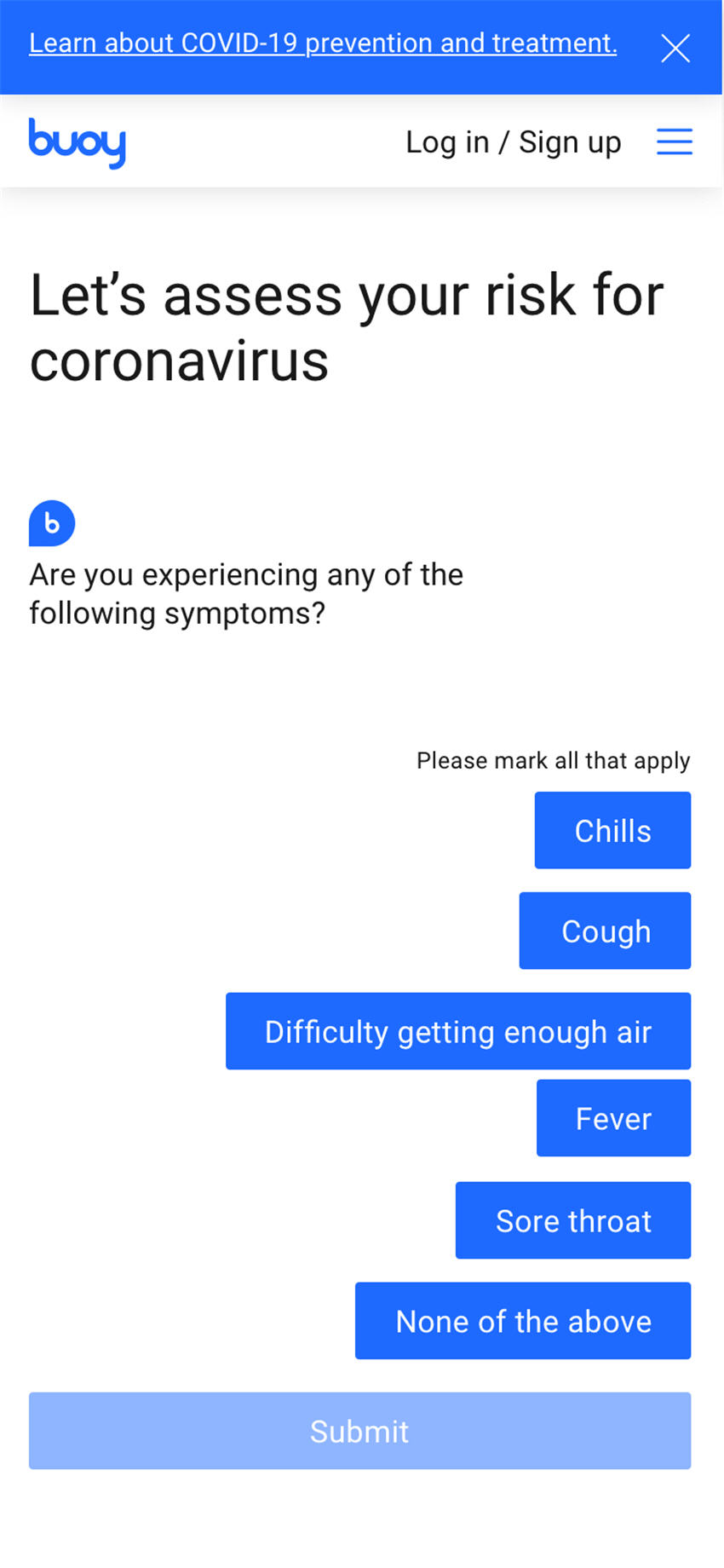 Khi đến website “buoy.com,” người ta sẽ được hỏi một số câu hỏi cơ bản như có bị ớn lạnh (chills), ho, sốt, khó thở không. Nếu ai bị mắc tất cả những triệu chứng trên thì sẽ được hỏi về giới tính, tuổi tác và thêm vài câu hỏi kế tiếp trước khi được hướng dẫn bước tiếp theo.