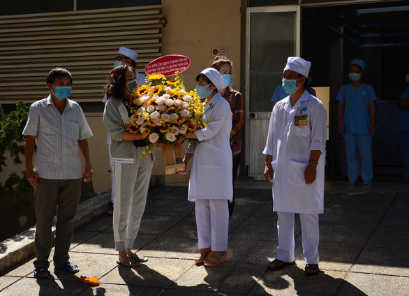 Sau khi xuất viện, bệnh nhân "siêu lây nhiễm" thứ 34 tặng lẵng hoa, cảm ơn đội ngũ y bác sĩ Bệnh viện Đa khoa Bình Thuận đã tận tình cứu chữa cho gia đình mình.