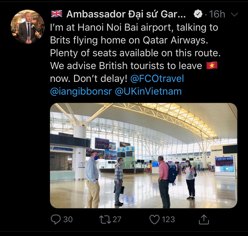 “Rất nhiều ghế trống trên đường bay này. Chúng tôi khuyên khách du lịch Anh rời Việt Nam ngay bây giờ. Đừng trì hoãn”, Đại sứ Anh tweet.