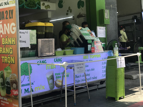 Một điểm bán các loại thức uống trên đường Phan Xích Long (quận Phú Nhuận, TPHCM) đã chuyển sang hình thức bán mang đi. Cửa hàng này bố trí các khu vực đặt hàng, thanh toán, lấy hàng để tránh tiếp xúc trực tiếp giữa người mua và người bán.