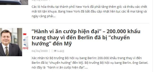 Hôm qua 3/4, đài RFI Tiếng Việt đưa tin với hàng tít “Tình liên đới thời virus corona: Mỹ ‘giật’ khẩu trang Pháp mua của Trung Quốc”. Bài báo viết: