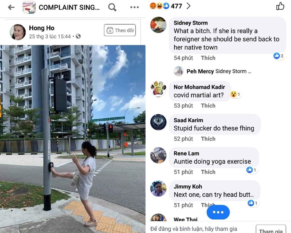 Bà Hồng, đang ở Mỹ, đăng lên facebook cá nhân tấm hình dùng chân để bấm nút dành cho người qua đường ở Singapore. Bà Hồng gọi đó là “cẩn tắc vô ưu, chỗ công cộng cứ lấy chân mà dụng...”. Nhiều người Singapore trong một diễn đàn trên facebook đề nghị gọi cảnh sát và tống xuất bà này về nước.