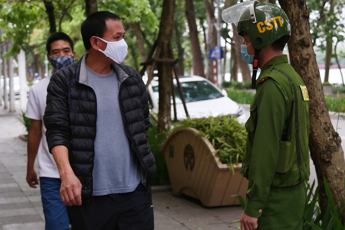 Công an quận Hoàn Kiếm ra quân nhắc nhở những người ra đường không có lý do. Ảnh: Phạm Dự.