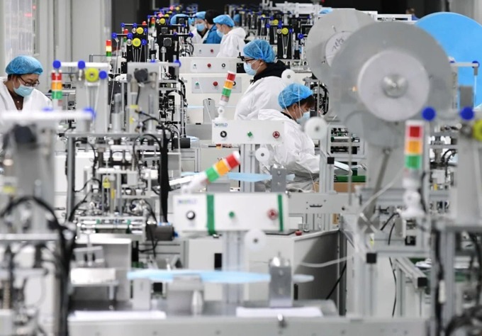 Một dây chuyền sản xuất khẩu trang tại Trung Quốc. Ảnh: Tân Hoa Xã