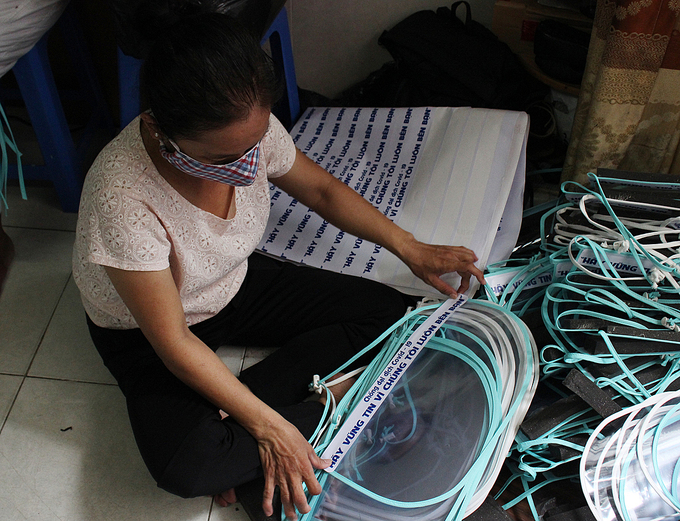 Bà Mỹ Lệ (66 tuổi) ở huyện Bình Chánh, cứ cách ngày lại chạy xe máy hơn 20km đến quận Phú Nhuận để tham gia làm nón. Công việc chính của bà là xỏ khóa vào dây. "Tôi không thấy vất vả, ngược lại còn thấy vui khi sản phẩm của mình được bác sĩ sử dụng trong quá trình chống dịch", bà Lệ nói.