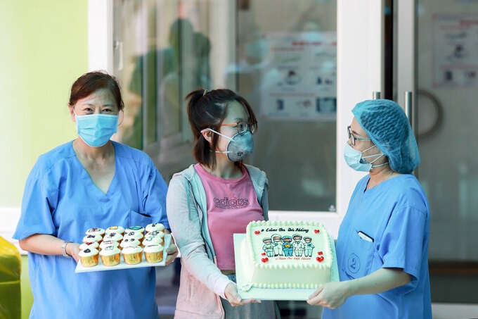 Trà My tặng bánh kem để cảm ơn các y bác sĩ đã tận tình cứu chữa. Cô cho biết khi hay tin mắc Covid-19 đã rất lo lắng, sau đó lấy lại tinh thần nhờ các bác sĩ tận tình động viên và chăm sóc.