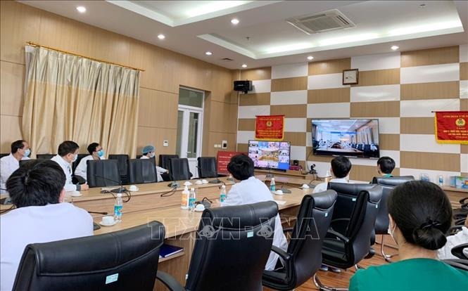 Buổi hội chẩn điều trị bệnh nhân COVID-19 nặng, sáng 10/4/2020 tại điểm cầu Bệnh viện Bệnh Nhiệt đới Trung ương cơ sở 2 (Đông Anh, Hà Nội). Ảnh: Hồng Hà/TTXVN phát