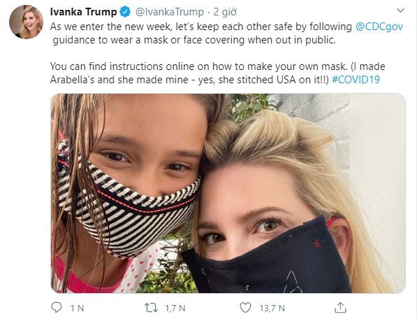 "Khi chúng ta bước sang tuần mới, hãy cùng nhau giữ an toàn bằng cách tuân theo hướng dẫn của CDC về việc đeo khẩu trang hoặc khăn che mặt khi đến nơi công cộng", Ivanka Trump viết trên Twitter.