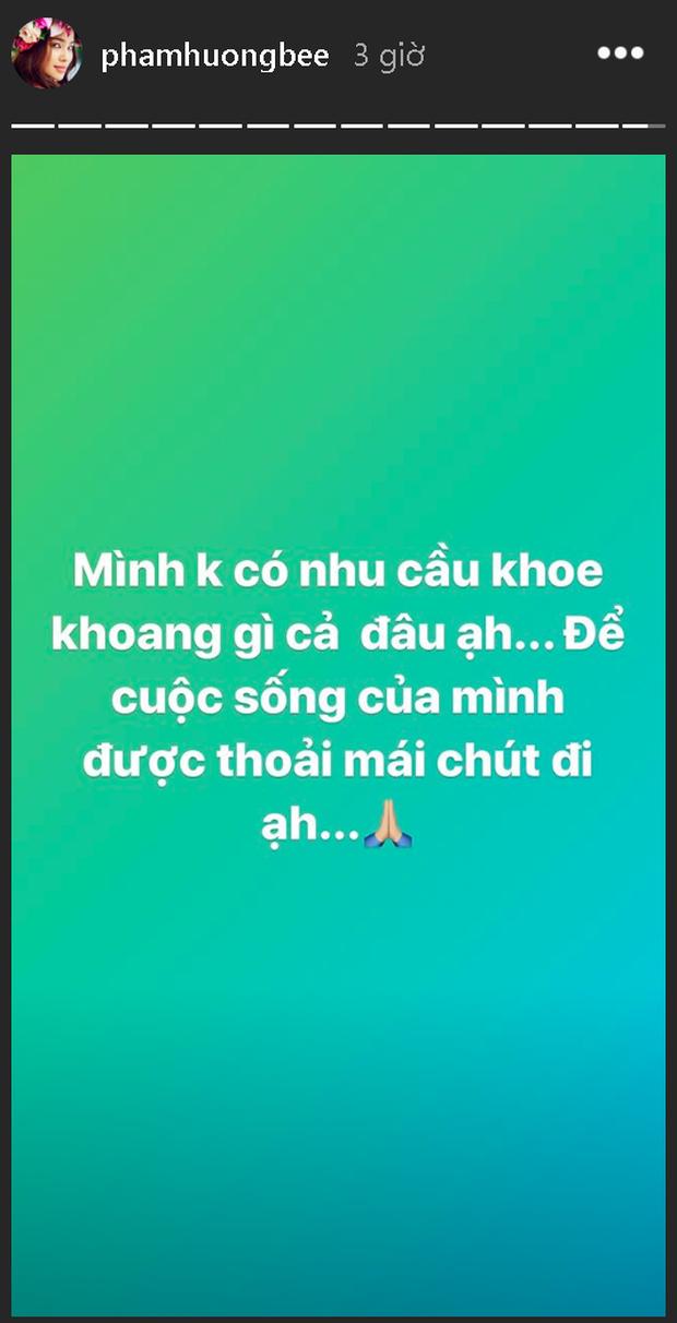 Trước những áp lực từ cộng động mạng, ngày 2/1 Phạm Hương đã đăng tải dòng trạng thái cực gắt. Cụ thể người đẹp gốc Hải Phòng viết: 'Mình không có nhu cầu khoe khoang gì cả đâu. Để cuộc sống của mình được thoải mái chút đi'. Có thể nói, đây là lần hiếm hoi phát ngôn của Phạm Hương nhận được nhiều sự đồng tình của cư dân mạng bởi lẽ, việc khoe khoang cuộc sống cá nhân không đáng để cô nhận phải nhiều sự chỉ trích đến vậy.