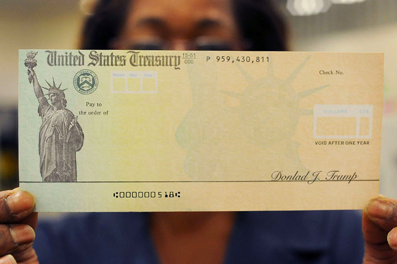 Theo gói giải cứu kinh tế của Đạo luật Hỗ trợ, Cứu trợ và An ninh Kinh tế Coronavirus - CARES . Hiện nay đã có 80 triệu người có tài khoản nhà băng đã nhận được tiền trên, mà không cần phải nhận tấm séc có ghi tên tổng thống Trump. Theo Bộ Ngân khố Hoa Kỳ cho biết thì có khoảng 70 triệu tấm séc nữa sẽ sớm gửi đến những người đang ở Mỹ nhưng không có tài khoản nhà băng. Điều đặc biệt trên tấm séc này sẽ ghi tên Tổng Thống Donald Trump. Vào cuối ngày 13/4. Bộ Tài chính yêu cầu Sở Thuế vụ (IRS) in dòng chữ "Tổng thống Donald J. Trump" lên góc trái của những tờ séc được gửi đến hỗ trợ người dân Mỹ gặp khó khăn vì Covid-19. Đây là lần đầu tiên tên Tổng thống Mỹ xuất hiện trên séc giải ngân của IRS.