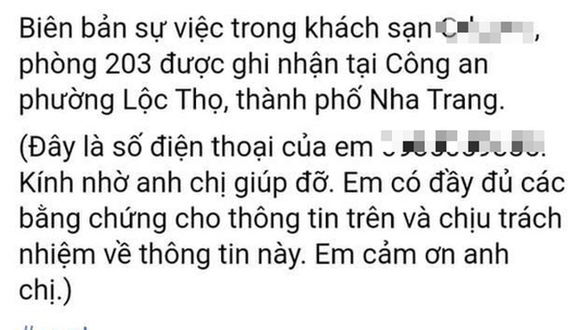 Bài viết ghi rõ ông A. đã quan hệ tình dục với cô K.N tại phòng 203 của một khách sạn trên đường Lý Tự Trọng, TP Nha Trang; sau đó đã trả giấy đăng ký xe, biên bản vi phạm ngay trong khách sạn. Bài viết còn cho rằng sự việc đã được ghi nhận tại Công an phường Lộc Thọ, TP Nha Trang. Tài khoản Facebook nói ông A. đã có vợ và hai con.