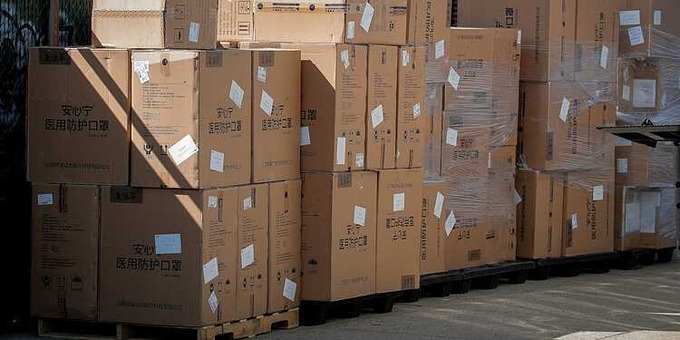 Lô khẩu trang N95 và đồ bảo hộ cá nhân được tập đoàn Alibaba của Trung Quốc chuyển tới New York hôm 8/4. Ảnh: Reuters.
