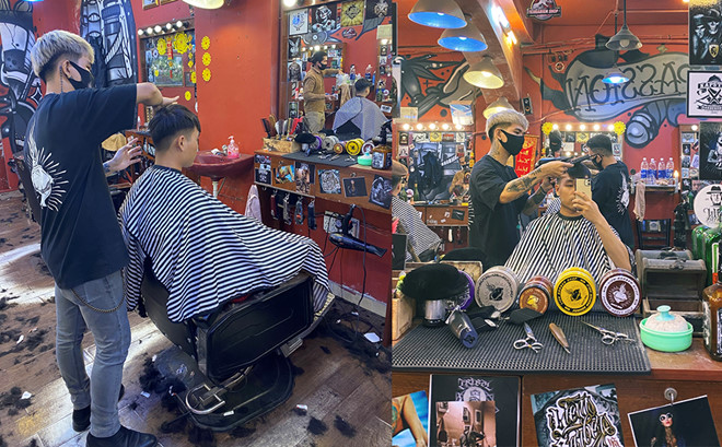 Nói về hình ảnh trên, anh Bùi Quang Hùng (29 tuổi) sáng lập chuỗi hệ thống tóc này chia sẻ: “Việc đeo mặt nạ bảo hộ khi cắt tóc nằm trong bộ tiêu chuẩn an toàn mà chúng tôi xây dựng dựa trên cơ sở khuyến cáo từ Bộ Y Tế. Ngoài đeo mặt 2 lớp bảo hộ, số lượng nhân sự làm việc và khách hàng được giới hạn chặt chẽ qua ứng dụng đặt lịch trước”.