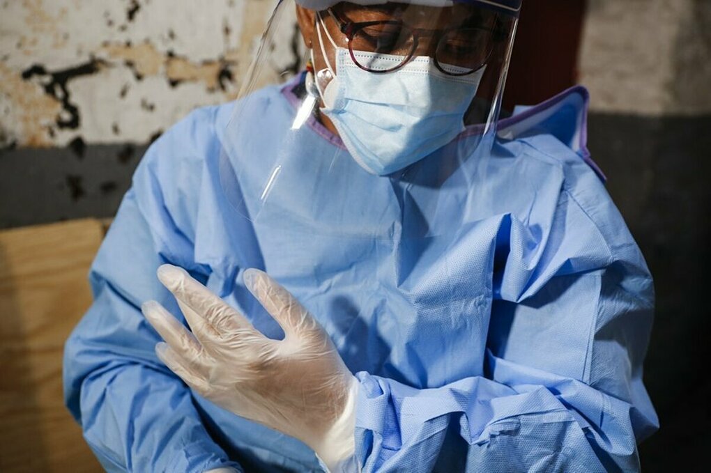 Y tá Ruth Caballero đeo găng tay trước khi chăm sóc cho bệnh nhân Covid-19. Ảnh: AP