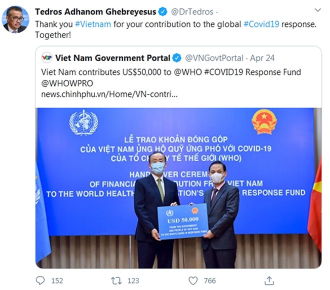 Tổng giám đốc WHO Ghebreyesus còn chia sẻ trên Twitter bản tin tiếng Anh đăng trên Cổng thông tin điện tử chính phủ Việt Nam với nội dung Việt Nam đóng góp 50.000 USD hỗ trợ Quỹ ứng phó Covid-19 của WHO, nhằm giúp giảm thiểu các tác động tiêu cực của đại dịch.