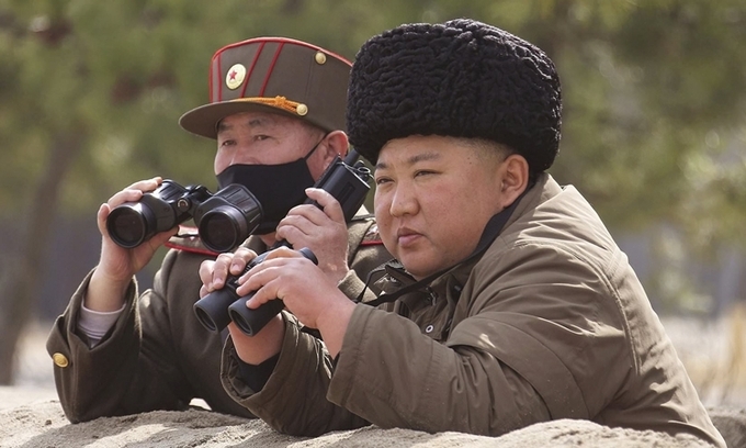 Kim Jong-un (phải) theo dõi một cuộc diễn tập ở Triều Tiên hồi tháng trước. Ảnh: KCNA.