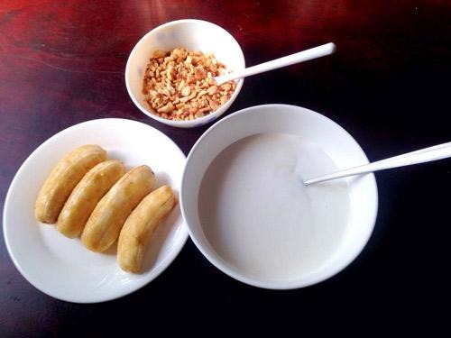 - Cho một thìa canh nước cốt lên chuối rồi rắc lạc rang lên.