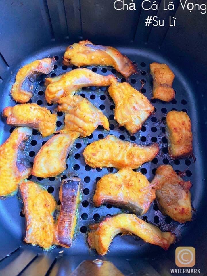Bước 3: Dùng nồi chiên không dầu để nướng cá, quét dầu ăn vào ngăn chiên rồi xếp cá ướp vào nồi. Bật 200 độ, thời gian 10 phút. Có thể nướng bằng than hoa hoặc lò nướng tùy hoàn cảnh. Nướng xong cho ra đĩa.