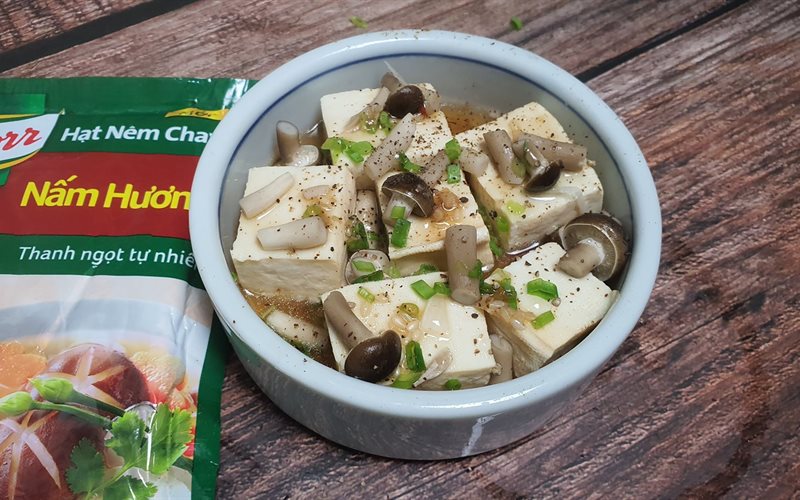 Cắt đậu hũ thành các khuôn vuông vừa ăn rồi cho vào chén sứ. Thêm vào đậu hủ 5gr hạt nêm chay Knorr, ướp cho các mặt thấm đều gia vị. Cắt nấm thành các khúc nhỏ, rửa sạch rồi cho lên mặt đậu hũ. Thêm ít hành lá cắt nhỏ cùng ít dầu hào chay lên mặt đậu hủ.