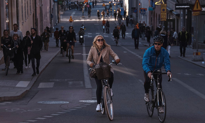 Người dân Thụy Điển đạp xe trên phố Gotgatan, thủ đô Stockholm, hồi tháng 4. Ảnh: NYTimes.