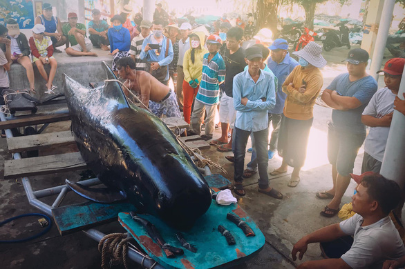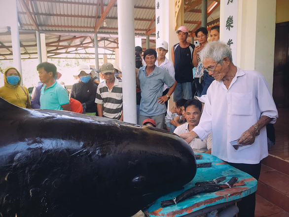 Khoảng 9h ngày 7-5, người dân phát hiện một con cá voi dài 4,5m, nặng hơn 1 tấn lụy bờ trong tình trạng thở yếu, có nhiều vết thương trên vây và lưng. Cá có đầu tròn, đuôi dẹp nên ngư dân gọi là Ông Chuông.
