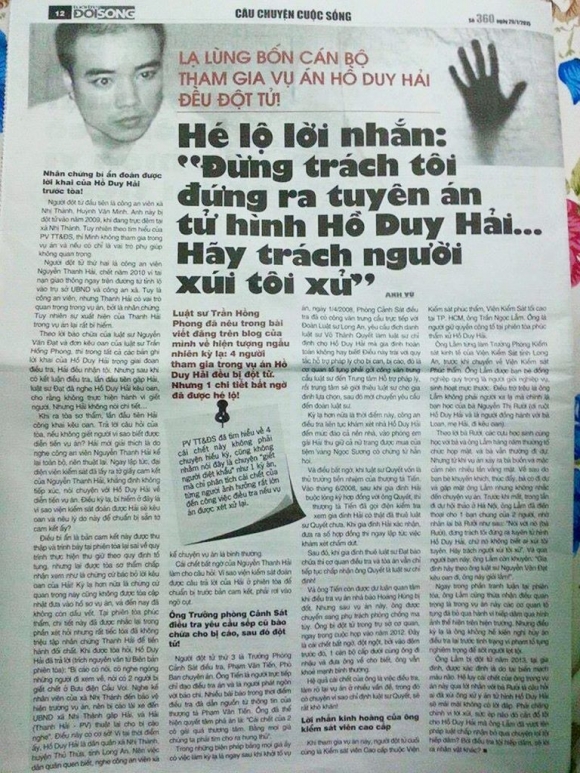 Bài báo “Hé lộ lời nhắn…” trên báo Đời Sống gây chấn động dư luận về vụ án Hồ Duy Hải.