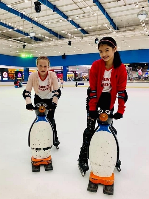 Ngoài ra, cô bé yêu thích các hoạt động thể thao, đặc biệt là môn trượt băng. Vào cuối tuần, Bảo Tiên (phải) đến sân trượt băng cùng bạn.