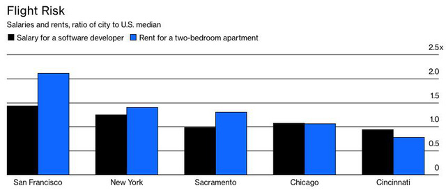Được coi là một trong những nơi có chi phí thuê nhà đắt đỏ nhất thế giới, vùng vịnh Bay Area đă phải đối mặt với cuộc khủng hoảng giá nhà đất cho thuê trong nhiều năm gần đây. Theo thống kê của Bloomberg về điều tra dân số Hoa Kỳ, mỗi đơn vị nhà được xây dựng tại đây từ năm 2011 đến 2017 cần tới 5,4 việc làm mới. Mọi chi phí ở bang San Francisco luôn đắt đỏ và giá trung b́nh để sở hữu một ngôi nhà không dưới 600.000 USD – cao gấp đôi so với giá nhà trung b́nh ở Mỹ. Điều này đồng nghĩa với việc hầu hết những kỹ sư công nghệ ở thung lũng Silicon đều lựa chọn đi thuê – do vậy họ có thể đến và đi bất cứ lúc nào.