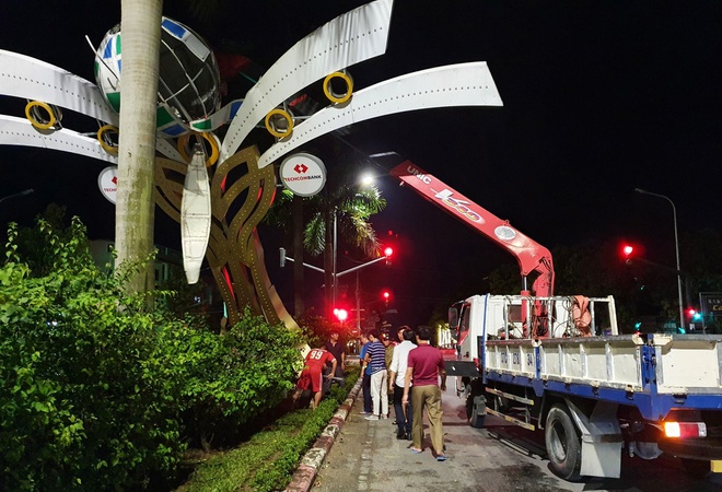 Mưa lớn cũng khiến nhiều cột đèn LED trang trí trên đại lộ Lê Nin (TP Vinh) bị quật ngã, nằm ngổn ngang dọc đường.