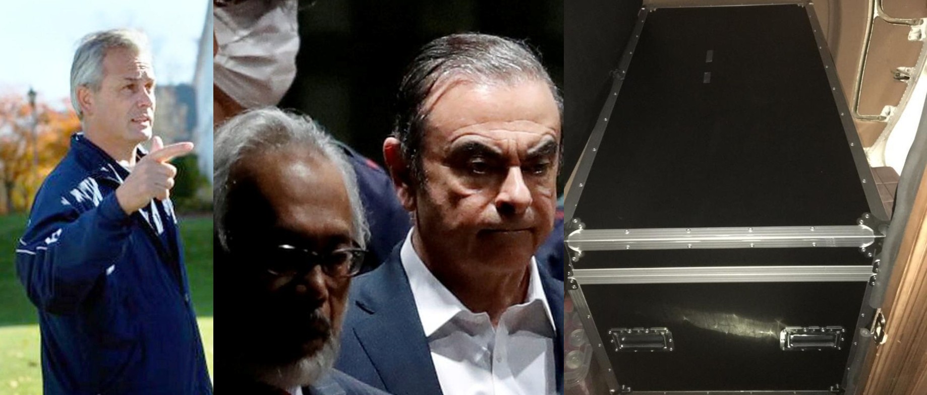 Từ bên trái là ông Michael Taylor, cựu chủ tịch Carlos Ghosn, và chiếc rương đựng nhạc cụ mà ông Ghosn đã trốn ở bên trong.