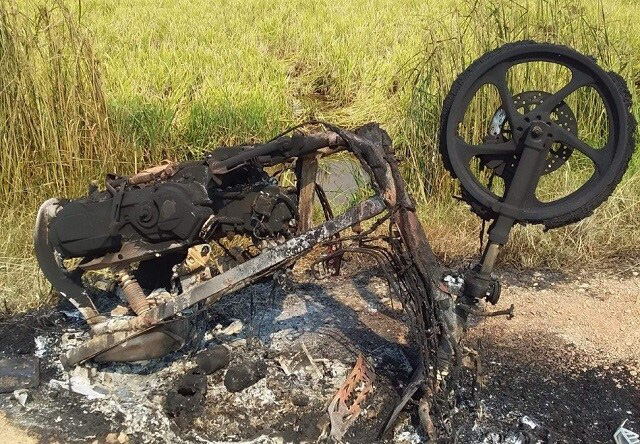 Chiếc xe máy bị đốt cháy trơ khung tại hiện trường. (Ảnh:CAQB)