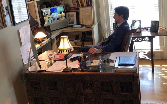 Thủ tướng Canada Justin Trudeau đăng bức ảnh đang dự họp trực tuyến với các lãnh đạo G7 vào ngày 17- 3-2020, do con gái Ella-Grace (11 tuổi) chụp lên Twitter - Ảnh: ELLA-GRACE