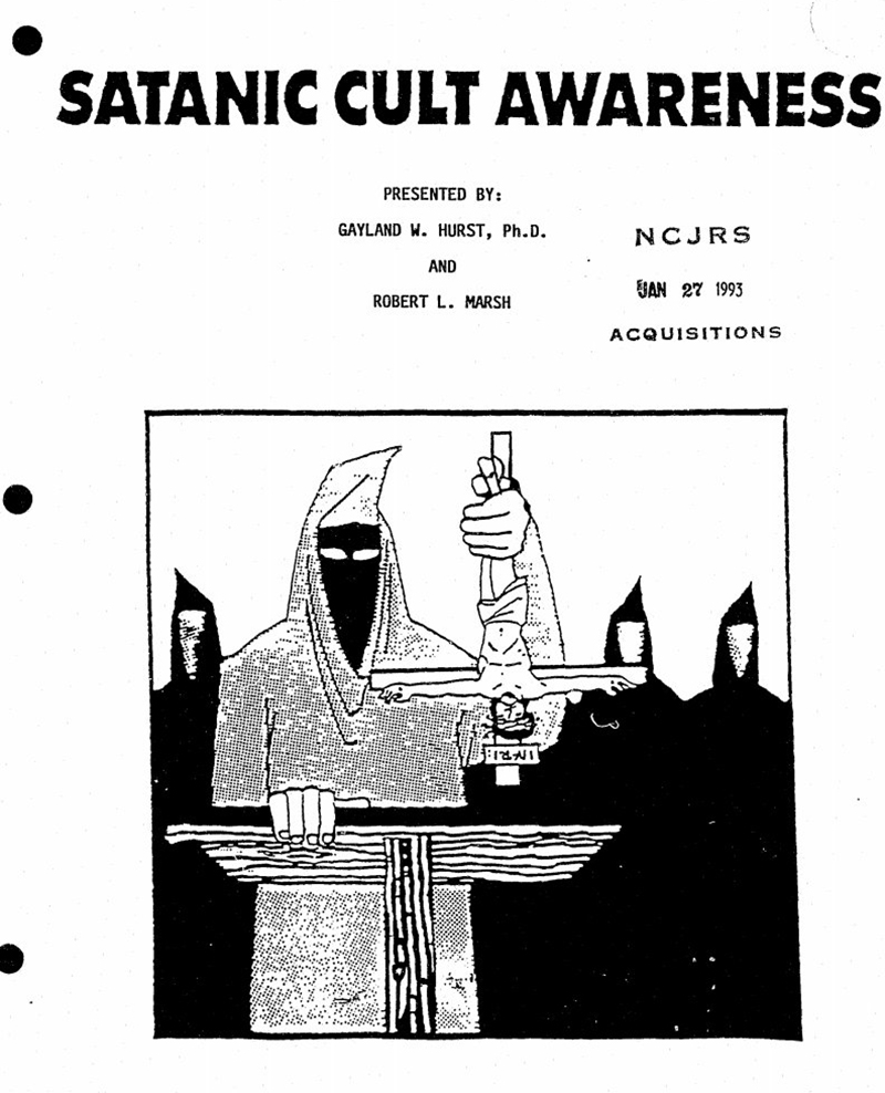 Tài liệu Satanic Cult Awareness xuất bản năm 1993 và được hỗ trợ bởi Viện Tư pháp Quốc gia của Bộ Tư pháp Hoa Kỳ khẳng định rằng, hình ảnh cây thánh giá lộn ngược thể hiện “sự báng bổ thánh giá Kitô giáo“. Tài liệu có đề cập trong một trang viết: “Biểu tượng này đại diện cho hòa bình vào đầu những năm 60; nhưng giờ đây, các tổ chức Thần bí học hay các nhóm nhạc Heavy Metal coi nó là biểu tượng ‘Thập giá của Nero’. Nó là hình một chiếc thập giá lộn ngược, và người bị đóng đinh sẽ bị đóng lộn ngược – ‘Thất bại của Kitô giáo’”.