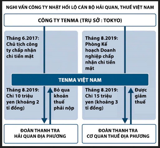 Một công ty Nhật ở Việt Nam đã tố cáo 1 cán bộ hải quan, thuế nhận hối lộ 5,4 tỉ đồng để trốn 400 tỉ tiền thuế. Truyền thông Nhật Bản loan tin công ty sản xuất nhựa Tenma thông báo với Tòa án quận Tokyo rằng công ty con của hãng tại Việt Nam đã hối lộ 25 triệu yen (5,4 tỉ đồng) cho giới chức địa phương để trốn thuế.