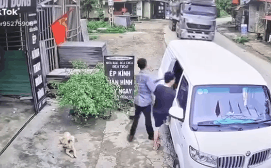 2 thanh niên đang đứng cạnh một chiếc xe khách 16 chỗ đỗ bên đường. Đang mải nói chuyện, một anh bất ngờ phát hiện chiếc xe ben lao tới chỗ mình. Hai thanh niên đứng ngoài lập tức chạy nhanh vào nhà. Thanh niên ngồi trong xe cũng cắm cổ lao ra ngoài.