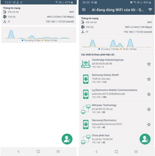 Chờ trong giây lát, ứng dụng sẽ quét và liệt kê danh sách đầy đủ các thiết bị đang được kết nối vào mạng Wifi của bạn (là mạng Wifi mà smartphone đang kết nối). Ứng dụng sẽ chỉ rơ tên và hiển thị loại thiết bị đang kết nối vào mạng Wifi, như smartphone, laptop, camera giám sát… để người dùng được biết.