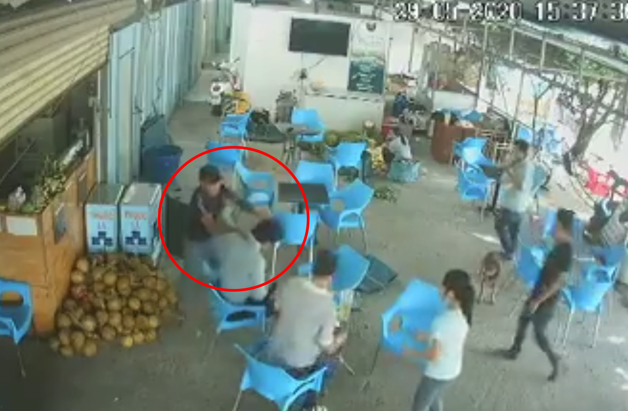 Chủ quán cà phê bị đánh tới tấp vì 2 đĩa cơm. Hai thanh niên cầm ghế ném liên tiếp vào người, chủ quán cà phê. Ông này chỉ còn cách tháo chạy...