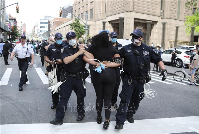 Cảnh sát bắt giữ một đối tượng quá khích tham gia biểu tình phản đối cái chết của một người da màu ở Hạ Manhattan, New York (Mỹ) ngày 29/5/2020. Ảnh: THX/TTXVN